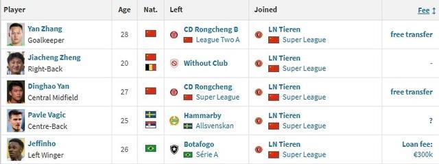 北京时间1月11日,德转更新,热菲尼奥、瓦吉奇、严鼎皓、郑家骋、张岩加盟辽宁铁人,其中热菲尼奥为租借,租借费30万欧。