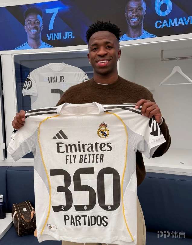 维尼修斯达成为皇马出战350场比赛里程碑,赛后他在社交媒体上晒出与纪念球衣的合照。